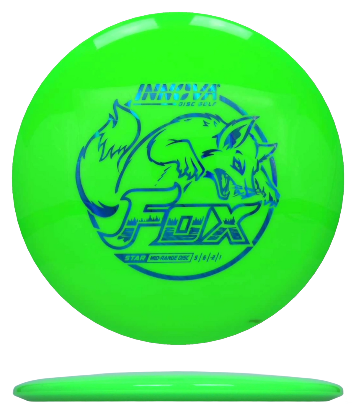 The Fox is rated 5 | 6 | −2 | 1. Speed 5 = true midrange pace for touch control. Glide 6 adds easy carry on low effort throws. Turn −2 gives gentle high-speed turn for hyzer-flips and shaping lines. Fade 1 delivers a mild, forward-pushing finish. Net result: straight or drifting turnover flights that land soft and predictable.